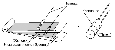 Иногда после этого проводится анодирование в борной кислоте для создания гладкой поверхности диэлектрика, но для конденсаторов с малым значением допустимого рабочего напряжение это анодирование обычно не проводится. После этого обкладки нарезаются лентами с шириной, соответствующей габаритам конденсатора и сворачиваются в трубочку вместе с проложенной электролитической бумагой, фиксируются полоской изолирующего материала (рис.10).