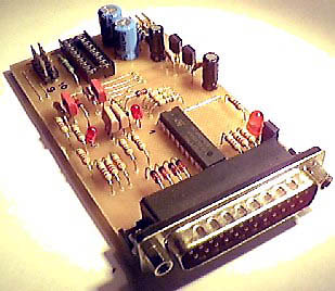 Внешний вид программатора в оригинальном виде приведен на рис.2. Однако схему пришлось немного доработать и разработать под нее печатную плату. Схема доработанного программатора приведена на рис.3. В ней применен дополнительный сигнальный буфер на микросхеме КР1554АП6, позволяющий применить провод длиной до 1 м. В остальном схема особенностей не имеет. Собрать ее можно на печатной плате (рис.4) при помощи "монтажки" (рис.5). Скачать эскиз печатной платы в формате Sprint Layout 3.0 можно отсюда.